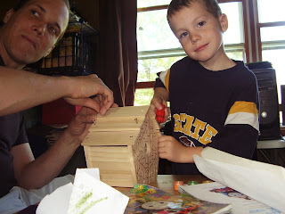 A couple of days after building this bird house, Liam stuck the little screwdriver inside and could not get it out. I could not get it out. We put the bird house aside and I figured I would have to take part of the roof off to retrieve the screwdriver. Nope. Gabe found the house and pulled the screwdriver out. Guess it just took smaller hands. Seriously, I am afraid of what lies ahead when Liam and Gabe start working together. Very afraid.